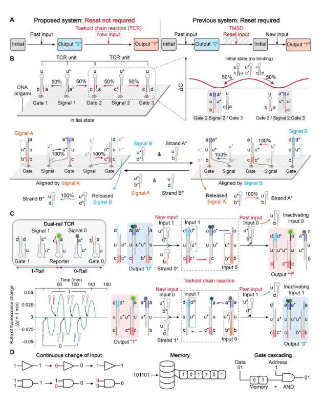 KAIST研究团队为攻克这一难题,设计出能够响应外部信号进行可逆组装与解组装的DNA分子,这种结构变化能够持久存在并编码信息,让系统具备存储历史输入并以此为基础进行后续计算的能力。