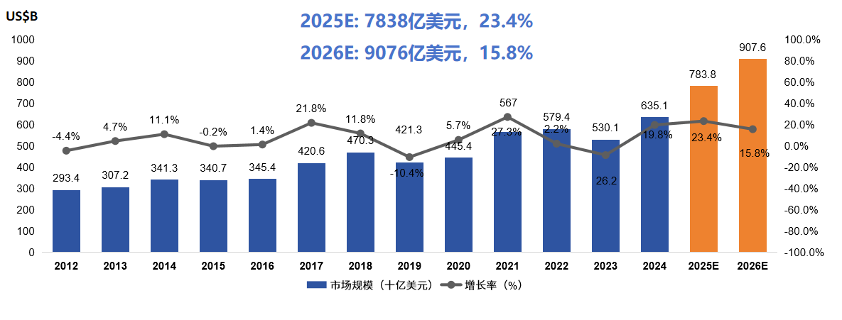 报告首先分析了2026年全球半导体市场的发展趋势。当前全球半导体市场加速进入“硅周期”上行阶段。大模型参数数量大、训练数据量大、模型复杂度高等特征对计算资源需求不断加强,高性能计算能力、大量存储空间、快速信息传输成为大模型训练和运行的计算核心要素,加大了对高性能半导体产品需求。存储器价格受全球存储三大巨头产能调节的影响,存储器价格呈现飞涨态势,出现供小于求态势。受AI强劲市场需求影响,预计2025年全球半导体市场规模将提升到7838亿美元,同比增长23.4%。2026年,预计存储市场将持续出现供货紧张局面,AI基础设施建设速度将小幅度降缓,市场规模将突破9000亿美元。